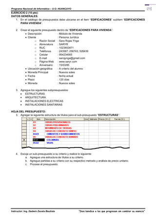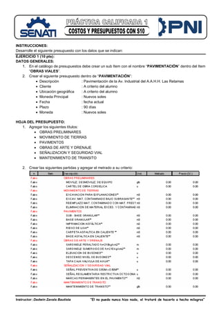 El documento presenta instrucciones para desarrollar dos presupuestos en un software de presupuestos. El primer presupuesto es para la pavimentación de una avenida e incluye secciones como obras preliminares, movimiento de tierras, pavimentos, obras de arte y drenaje, señalización y seguridad vial, y mantenimiento de tránsito. El segundo presupuesto es para un módulo de vivienda e incluye subpresupuestos de estructuras, arquitectura, instalaciones eléctricas e instalaciones