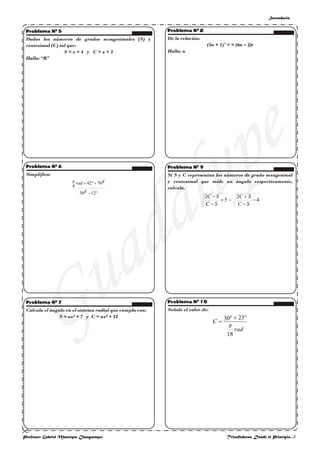 Este documento contiene varios problemas matemáticos que involucran cálculos con ángulos en grados sexagesimales, centesimales y radianes. Se pide calcular valores numéricos, hallar el mayor ángulo en un cuadrilátero, simplificar expresiones y determinar el valor de "n" en una relación dada.