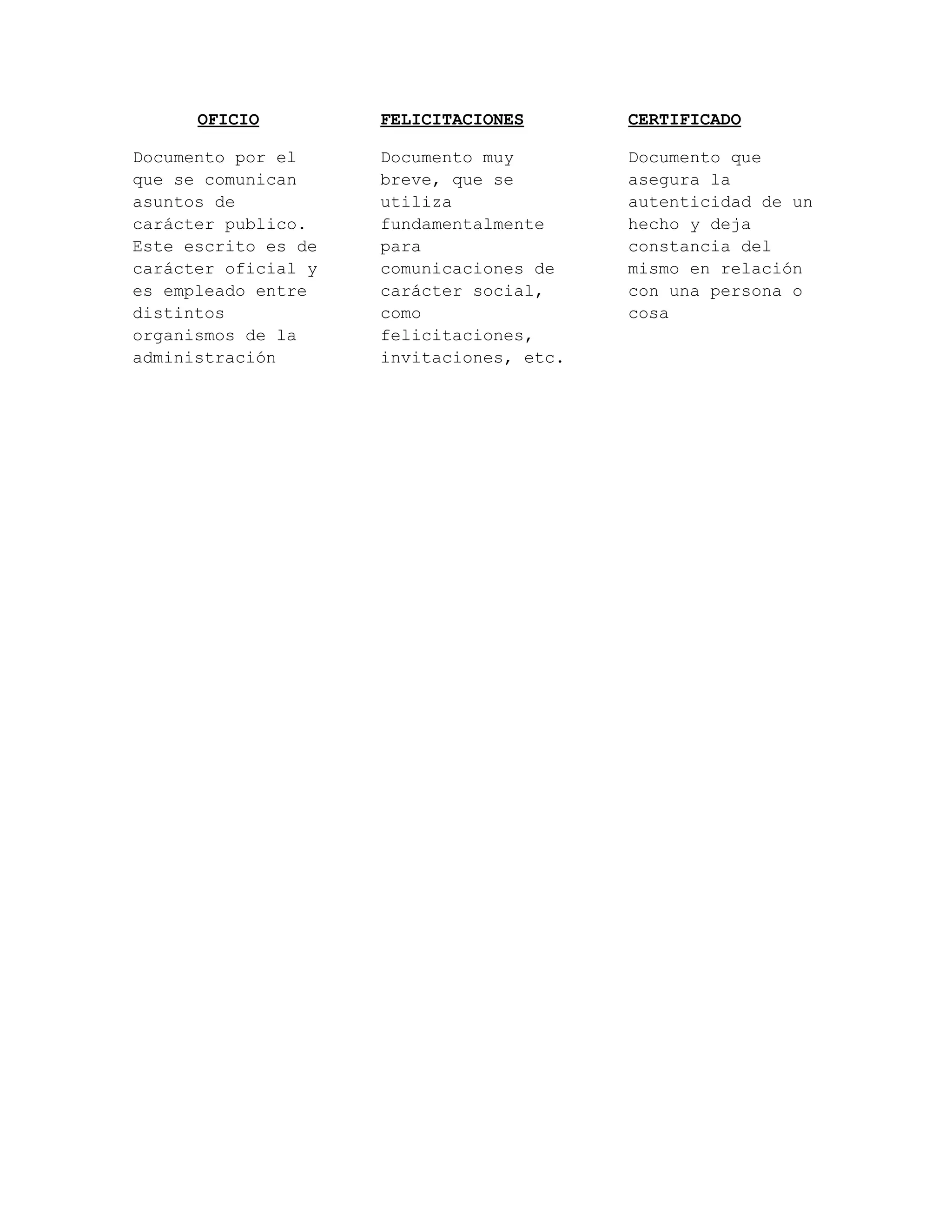 Este documento describe tres tipos de documentos: oficios, felicitaciones y certificados. Los oficios comunican asuntos públicos de manera oficial entre organismos de administración. Las felicitaciones son breves y se usan para comunicaciones sociales como felicitaciones e invitaciones. Los certificados aseguran la autenticidad de un hecho y dejan constancia de ello en relación con una persona o cosa.