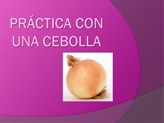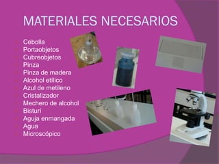 Este documento proporciona instrucciones para preparar una muestra de cebolla para su observación microscópica. Se requieren materiales como cebolla, portaobjetos, cubreobjetos, pinzas, alcohol etílico y azul de metileno. El procedimiento incluye cortar una capa fina de cebolla, calentarla con alcohol, teñirla con azul de metileno, colocar el cubreobjetos y prepararla para su visualización bajo el microscopio.