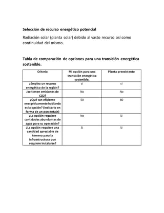 La localidad descrita tiene un clima semi-cálido sin viento, con alta radiación solar y flora y fauna no afectadas. Cuenta con terreno llano y accesible, alta radiación solar y ausencia de ductos de gas o campos petrolíferos. Dada la abundante radiación solar, la mejor opción energética es una planta solar, que usa los recursos disponibles localmente sin emisiones de CO2.