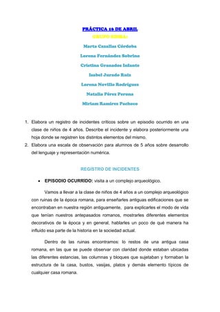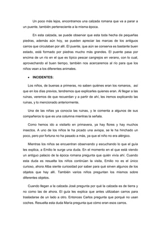 Los niños visitaron un complejo arqueológico romano para aprender sobre la vida de los antiguos romanos. Durante la visita, varios niños hicieron preguntas sobre las ruinas y objetos que veían, y uno se lastimó la rodilla. La maestra también creó una escala de observación para evaluar el desarrollo del lenguaje y las habilidades numéricas de los niños de 5 años.