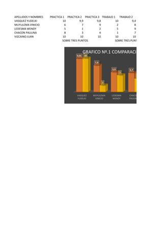 Este documento presenta los resultados académicos de 5 estudiantes en diferentes prácticas y trabajos a lo largo de un semestre. Incluye tablas con las calificaciones de cada estudiante, un gráfico comparando las calificaciones en las primeras 2 prácticas, y otro gráfico comparando las calificaciones en prácticas y trabajos. Adicionalmente presenta estadísticas como el promedio general, la calificación más alta y más baja.