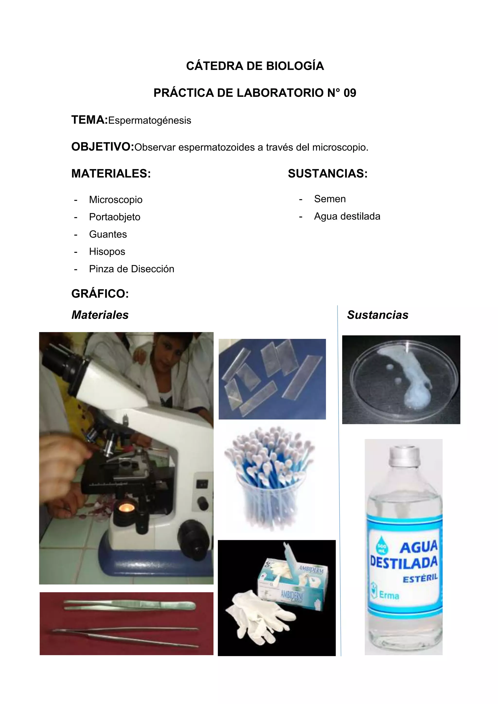 Este documento presenta los objetivos, materiales, procedimientos y resultados de un laboratorio de biología sobre espermatogénesis. Los estudiantes observaron espermatozoides a través de un microscopio usando muestras de semen, portaobjetos y varios lentes para ver las características de los espermatozoides como la cabeza y cola. El laboratorio les permitió ver los espermatozoides con más detalle y entender su estructura a un nivel microscópico.