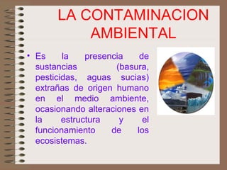 La contaminación ambiental se refiere a la presencia de sustancias extrañas de origen humano en el medio ambiente que alteran los ecosistemas. Sus efectos incluyen enfermedades y muerte masiva en seres vivos, e incluso la desaparición de especies. Los contaminantes pueden ser químicos como pesticidas y metales pesados, físicos como la radiactividad y el ruido, o biológicos.