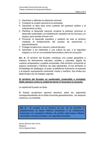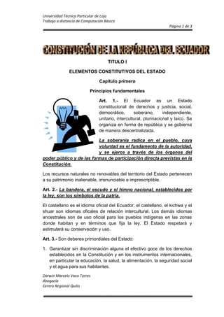 Este documento establece los principios fundamentales del Estado ecuatoriano. Define al Ecuador como un Estado constitucional, democrático, soberano e independiente. Estipula que la soberanía radica en el pueblo y que los recursos naturales pertenecen al patrimonio del Estado. También determina los deberes primordiales del Estado como garantizar los derechos de sus habitantes y fortalecer la unidad nacional.
