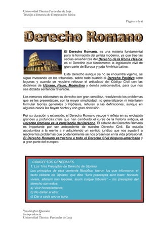 El documento habla sobre la importancia del Derecho Romano para la formación jurídica. El Derecho Romano sentó las bases de los códigos civiles europeos y latinoamericanos. Aunque ya no es vigente, aún se invoca en tribunales cuando hay lagunas legales. Los romanos elaboraron su derecho de manera sencilla y concisa. Se mencionan los tres preceptos de Derecho de Ulpiano que fundamentan la justicia. Finalmente, se brinda información biográfica sobre Ulpiano y la estructura del Derecho Romano.