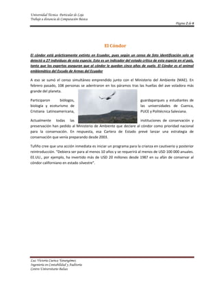 Este documento presenta información sobre dos especies en peligro de extinción: las tortugas gigantes de Galápagos y el cóndor andino. Describe las características físicas de las tortugas de Galápagos y los factores que amenazan su supervivencia. Explica que solo quedan 27 cóndores andinos en Ecuador y que se requieren esfuerzos urgentes como programas de cría en cautiverio para salvar la especie.