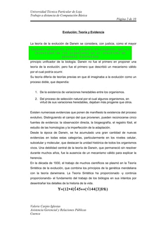 Este documento presenta una introducción a la teoría de la evolución biológica. Explica que Darwin no fue el primero en proponer la evolución, pero fue el primero en describir un mecanismo válido, la selección natural, por el cual podría ocurrir la evolución. También describe las cinco principales evidencias que apoyan la teoría de la evolución: observación directa, biogeografía, registro fósil, homologías y imperfección de la adaptación.