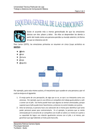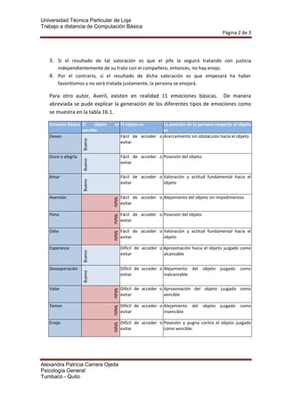 1) Existen dos emociones básicas: placer y dolor, y de ellas se derivan otras como el miedo, amor, ternura, enojo y angustia. 2) Para otro autor, las emociones básicas son 11 y dependen de cómo se percibe un objeto y la posición de la persona frente a él. 3) Las emociones complejas surgen de la interacción entre la percepción individual y los estímulos del entorno, que pueden ser cercanos o lejanos.