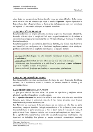 Las plantas son seres vivos que nacen, crecen, respiran, se alimentan y se reproducen. A diferencia de los animales, las plantas pueden producir su propia comida mediante un proceso llamado fotosíntesis, utilizando la energía del sol, agua, dióxido de carbono y sales minerales. Las plantas están formadas principalmente por raíces, tallos y hojas, cada una con funciones vitales como la absorción de agua y nutrientes, el transporte de savia y la fotosíntesis.