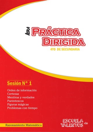 2) Los problemas incluyen situaciones sobre el ordenamiento de personas alrededor de una mesa, la identificación de profesiones y lugares de residencia basado en pistas, y determinar conclusiones lógicas a partir de afirmaciones contradictorias.