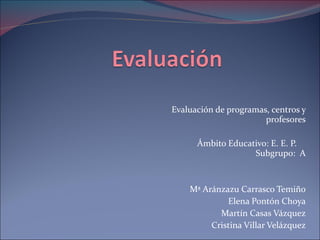 El documento presenta diferentes definiciones de evaluación de acuerdo a varios autores. Se define la evaluación como el grado de cambio en los estudiantes, la superación de objetivos, un proceso sistemático de enjuiciamiento, y un proceso dinámico para reorientar la práctica educativa. Finalmente, se ofrece una definición propia de evaluación como el uso de estrategias y métodos para conocer lo ocurrido en las secuencias didácticas y valorar la coherencia entre los objetivos, contenidos y metodología.