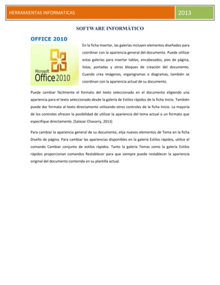 El documento describe las herramientas informáticas Office 2010, incluyendo Microsoft Word, Excel, PowerPoint, Outlook y OneNote. Explica que cada programa permite insertar elementos como tablas, encabezados y pies de página a través de galerías. Además, permite cambiar fácilmente el formato y apariencia del texto y documentos mediante la selección de estilos y temas.