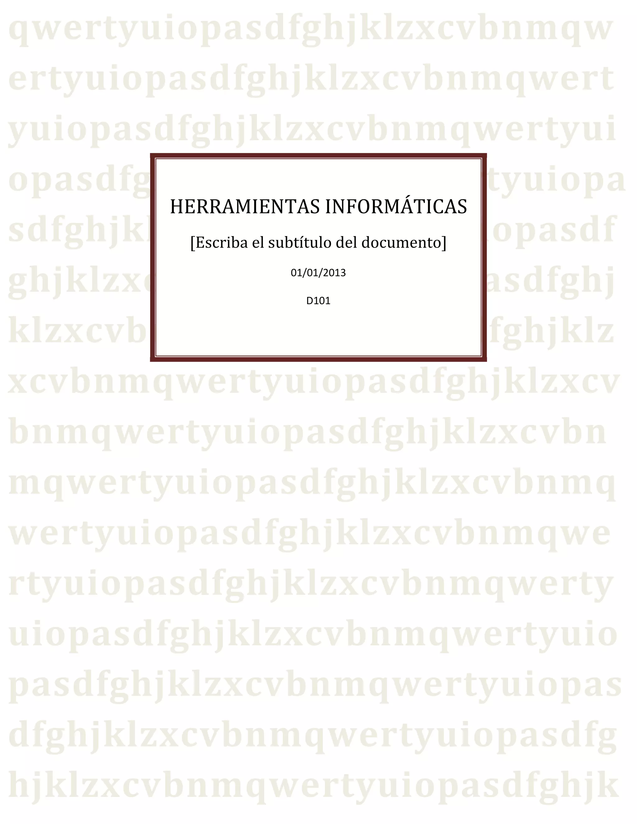 El documento presenta información sobre diferentes herramientas informáticas como Office 2010, Microsoft Word 2010, Excel 2010, Power Point 2010, Outlook 2010 y One Note 2010. Describe las funciones básicas de formato de texto, inserción de elementos y cambio de temas que comparten estas herramientas. También incluye una sección de bibliografía al final.