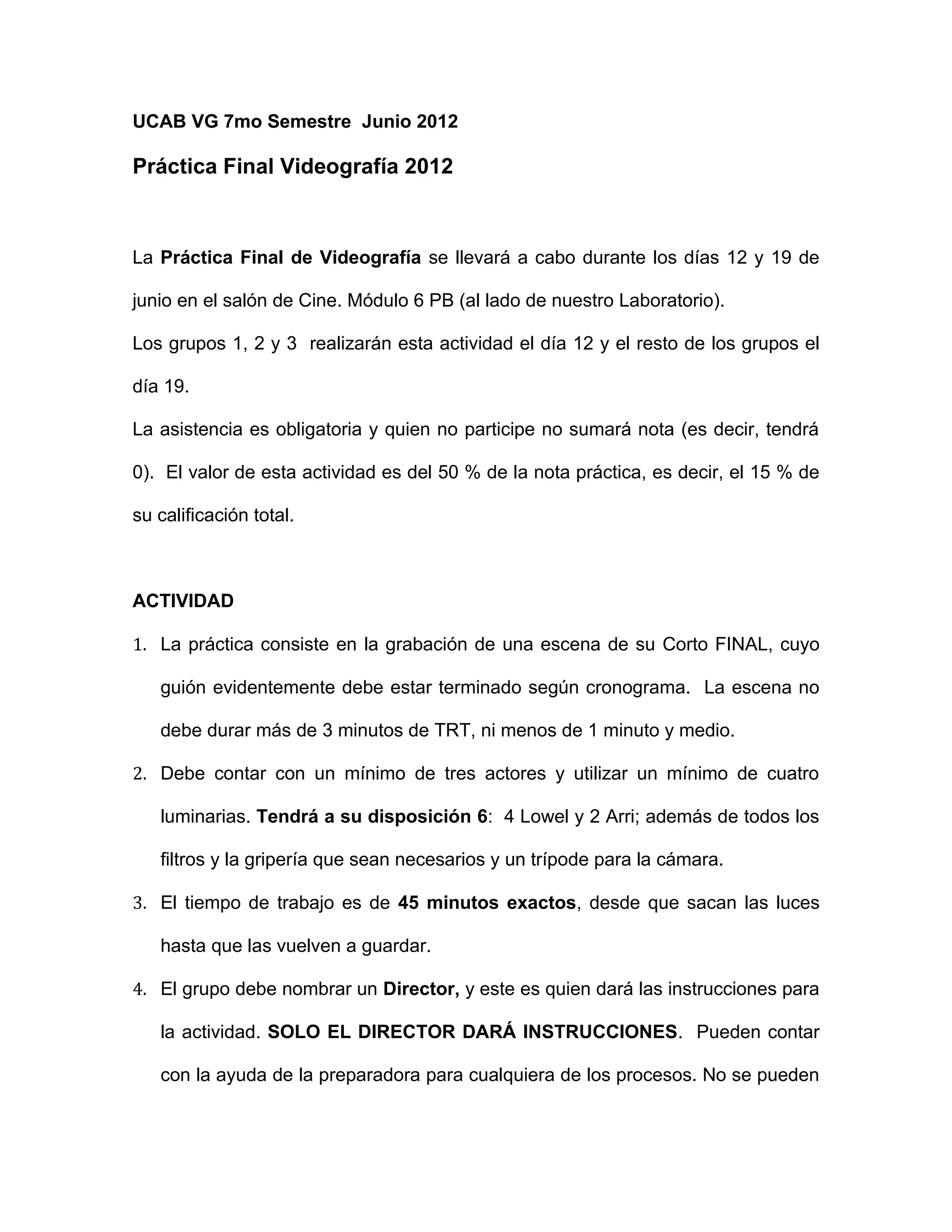 La Práctica Final de Videografía se llevará a cabo durante los días 12 y 19 de junio en el salón de Cine del módulo 6 PB. Los estudiantes grabarán una escena de 3 a 5 minutos de su cortometraje final utilizando al menos 3 actores, 4 luminarias y 3 tipos de planos. El grupo nombrará un director y tendrá 45 minutos para grabar. Deberán editar y publicar la escena en su blog dentro de los siguientes 5 días. La asistencia es obligatoria y la actividad representa el 15% de la