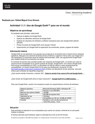 Este documento proporciona instrucciones para usar la aplicación Google Earth. Explica que Google Earth permite explorar el mundo en 2D y 3D usando imágenes satelitales. Describe las tres versiones disponibles y los requisitos técnicos para ejecutarla. Además, guía al usuario a través de varias tareas como navegar la interfaz, buscar ubicaciones y ver coordenadas geográficas. El objetivo es familiarizar al usuario con las funciones básicas de Google Earth.