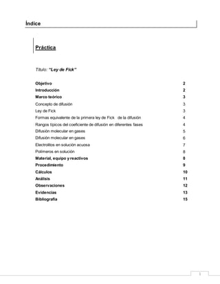 Este documento presenta los resultados de dos experimentos para calcular la difusividad (Dab) de diferentes sustancias. En el primer experimento, se calculó Dab del permanganato de potasio en agua. En el segundo experimento, se calculó Dab en agua de una solución de agua-tinta vegetal usando un volcán sumergible de difusividad. El documento también incluye la teoría sobre la ley de Fick y los rangos típicos de coeficientes de difusión en diferentes fases como gases, líquidos y sólidos.