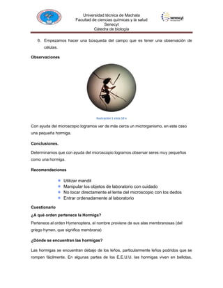 Este documento describe una práctica de laboratorio realizada por una estudiante para observar un microrganismo (una hormiga) con y sin microscopio. El procedimiento incluyó limpiar el material, colocar la muestra en el microscopio, encenderlo y buscar el campo de visión. La estudiante pudo observar de cerca la hormiga y determinó que el microscopio permite ver seres muy pequeños. Se recomienda manipular los objetos con cuidado y no tocar el lente.