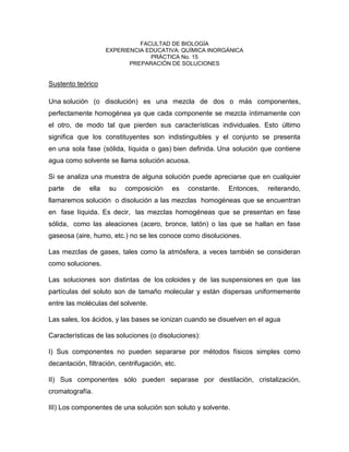Este documento presenta los objetivos, materiales y procedimiento de una práctica de laboratorio sobre la preparación de soluciones. Los estudiantes prepararon soluciones acuosas de varios reactivos químicos a diferentes concentraciones y observaron sus propiedades. A través de esta actividad, los estudiantes pudieron comprender mejor las características de las soluciones y la clasificación de éstas según su concentración de soluto.