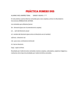 El alumno Raúl Ramírez Toral de 1° "I" realizó una práctica en la que utilizó comandos como dir, cd, md, rd y copy para crear carpetas, subcarpetas, copiar archivos e imágenes y navegar entre directorios desde la herramienta Símbolos del Sistema.