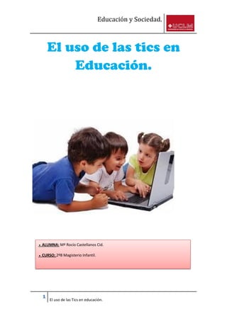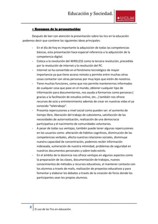 El documento discute el uso de las TIC en la educación. Señala que las TIC han traído la tercera revolución en la educación después de Internet y los ordenadores personales. Las TIC permiten a los estudiantes y profesores mantenerse informados, completar proyectos educativos en línea, y comunicarse a distancia. Sin embargo, también pueden causar problemas como la disminución de las habilidades de comunicación y concentración si se usan en exceso. El documento concluye que las TIC son una herramienta útil para la educación