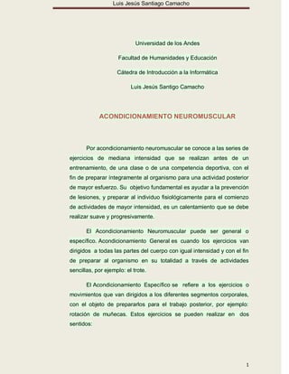 El documento habla sobre el acondicionamiento neuromuscular, que son ejercicios de mediana intensidad antes de un entrenamiento para preparar al cuerpo. Puede ser general, dirigido a todo el cuerpo, o específico, dirigido a partes específicas. Se recomienda realizar primero ejercicios generales suaves como trotar y luego ejercicios específicos de forma ascendente o descendente.