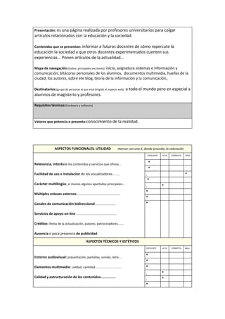 Este documento presenta una evaluación de tres páginas web de interés educativo realizada por una estudiante como parte de sus prácticas del módulo II de Educación y Sociedad. Se resumen las tres páginas web evaluadas, que incluyen recursos educativos en línea para docentes y alumnos con necesidades educativas especiales. La estudiante concluye que las páginas web ofrecen actividades útiles y atractivas para los destinatarios.