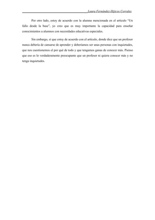 El documento habla sobre el preocupante bajo nivel de conocimientos culturales de los futuros maestros y el problema que esto plantea. Señala que los maestros deben dominar los conocimientos que enseñan y conocer los fundamentos básicos de sus disciplinas. También cuestiona si se está capacitando adecuadamente a los futuros maestros y si deberían cambiarse aspectos del programa para asegurar que adquieran los conocimientos necesarios.