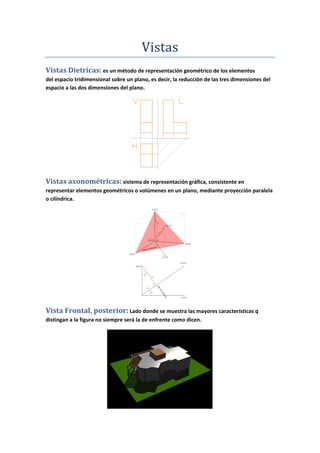 Este documento describe diferentes tipos de vistas utilizadas para representar elementos tridimensionales en un plano bidimensional. Explica que las vistas diédricas reducen las tres dimensiones del espacio a dos mediante proyección, mientras que las vistas axonométricas usan proyección paralela o cilíndrica. Además, define las vistas frontal, posterior, lateral, inferior y superior y sus posiciones relativas.