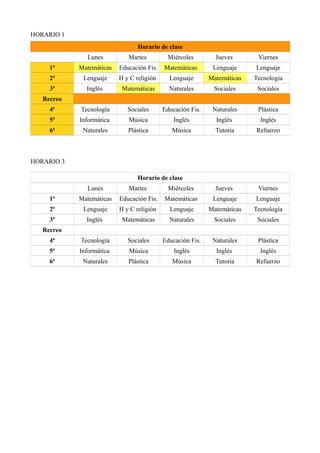 El documento presenta el horario de clases semanal de dos grupos diferentes. En el horario 1 y 3 se detallan las asignaturas que se imparten cada día de la semana de la primera a la sexta hora, incluyendo un recreo. Las asignaturas incluyen matemáticas, lenguaje, inglés, ciencias naturales, ciencias sociales, educación física, tecnología, música, plástica e informática.