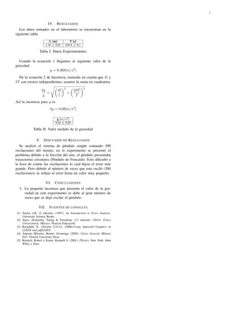 Este documento describe un experimento para medir la gravedad usando un péndulo simple. Los objetivos son determinar el valor de la aceleración de la gravedad de la Tierra y medir el período de oscilación del péndulo con la mínima incerteza posible. El experimento involucra medir el período de 300 oscilaciones de un péndulo de longitud conocida. Los resultados se usan para calcular el valor de la gravedad y su incerteza.