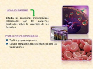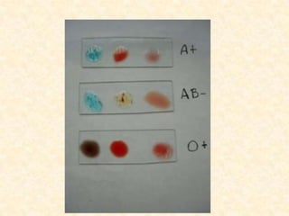 La práctica describe la tipificación de grupos sanguíneos e incluye la identificación de antígenos en los glóbulos rojos mediante el uso de anticuerpos específicos. Se explican los sistemas sanguíneos ABO y Rh, incluyendo los antígenos y anticuerpos involucrados. El procedimiento involucra mezclar gotas de sangre con sueros anti-A, anti-B y anti-D para identificar el grupo sanguíneo observando la aglutinación.