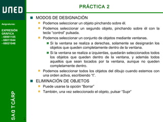 El documento proporciona instrucciones sobre diversas herramientas y comandos en AutoCAD, incluyendo cómo seleccionar y eliminar objetos, usar las referencias a objetos, entradas dinámicas, y editar la geometría mediante operaciones como copiar, girar y escalar. Explica también el uso de la rejilla, modo orto y rastreo polar para dibujar con precisión.