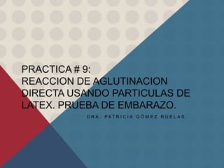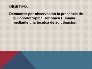 Este documento describe una prueba de embarazo utilizando partículas de látex recubiertas con anticuerpos contra la gonodotropina coriónica humana (HCG). La orina de la mujer se mezcla con el reactivo de látex y si está presente la HCG, se producirá una aglutinación granulosa del látex que indica un resultado positivo. El procedimiento, interpretación de resultados y posibles causas de falsos positivos y negativos se explican en menos de tres oraciones.