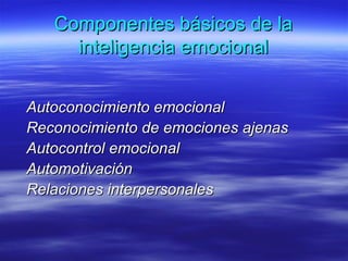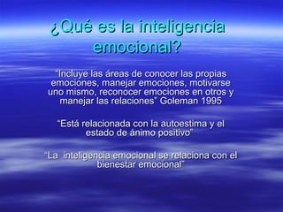 El documento define la inteligencia emocional como la capacidad de conocer las propias emociones, manejar las emociones, motivarse uno mismo y reconocer emociones en otros. Explica que está compuesta de varios componentes como el autoconocimiento emocional, el reconocimiento de emociones ajenas, la automotivación y las relaciones interpersonales. También describe distintas estrategias para el control de emociones, el manejo del estrés y las habilidades sociales que son parte de la inteligencia emocional.