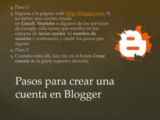 Este documento proporciona instrucciones en 6 pasos para crear una cuenta en Blogger. También incluye información sobre el Bulldog Francés, incluyendo su origen, personalidad, cuidados de salud y alimentación. El documento recomienda dividir la comida del perro en dos raciones diarias y evitar dejarlo solo por largos períodos.