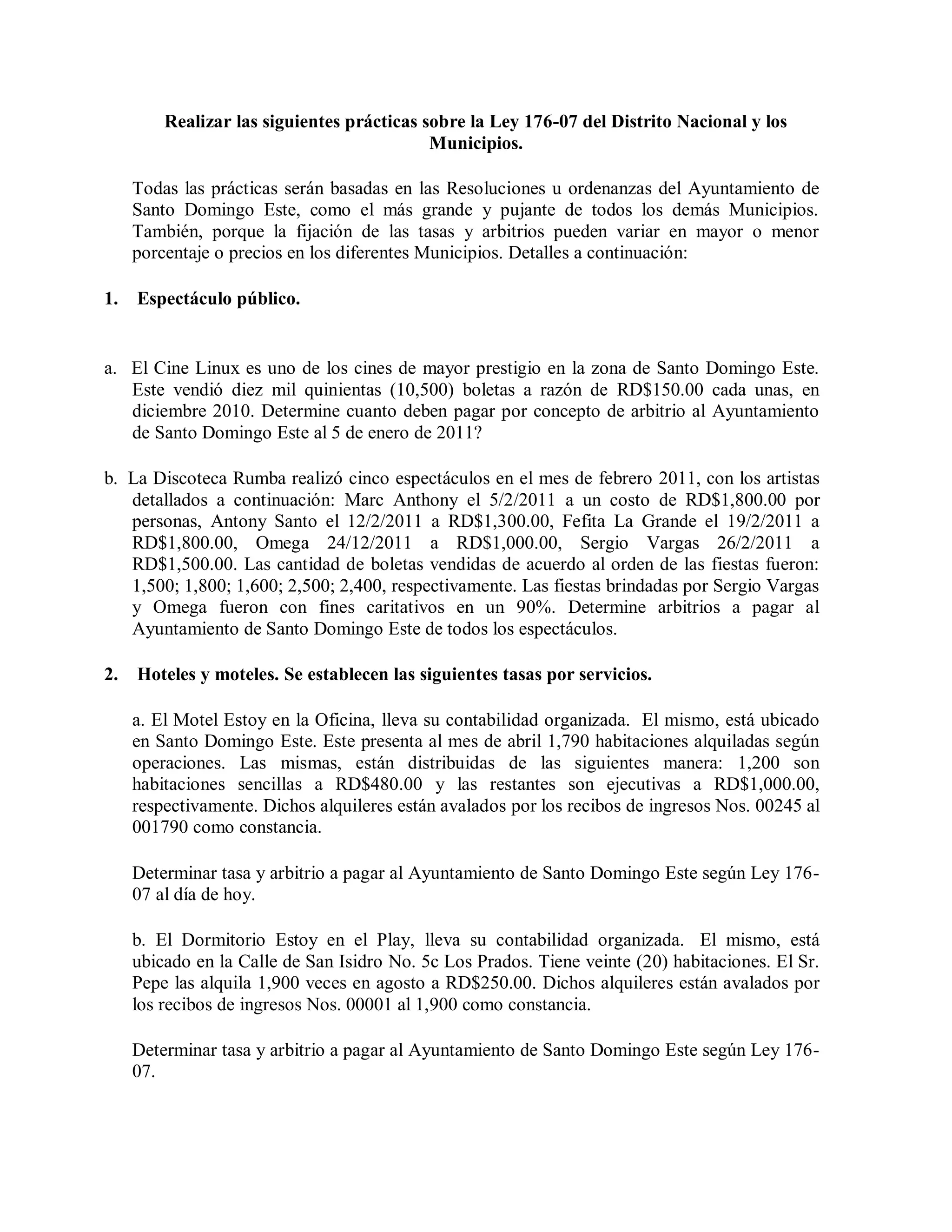 El documento presenta varios ejercicios y casos prácticos relacionados con la aplicación de la Ley 176-07 sobre tasas y arbitrios municipales en Santo Domingo Este. Incluye cálculos de arbitrios para diferentes negocios como cines, discotecas, hoteles, galleras, colmadones y más, así como también casos relacionados con construcciones, cementerios, mataderos y recolección de basura.