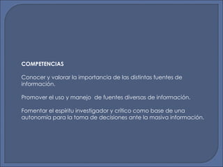 El documento describe las competencias y objetivos de aprendizaje relacionados con el uso de recursos electrónicos para la investigación. Los estudiantes aprenderán a buscar y evaluar información en revistas electrónicas y canales RSS, y completarán dos actividades para practicar estas habilidades investigando revistas y artículos sobre el Río Tinto.