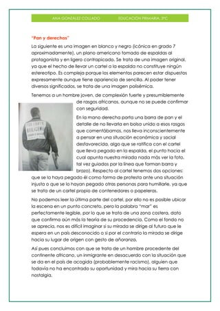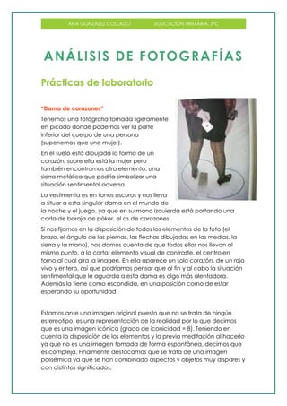 El documento presenta el análisis de tres imágenes realizado por una estudiante. La primera imagen representa a una "Dama de corazones" con elementos como un corazón dibujado y una sierra que simbolizan su situación sentimental. La segunda imagen muestra a un hombre inmigrante en desacuerdo con la situación racista en su país de acogida. La tercera imagen retrata a una anciana mendiga invidente que pide ayuda económica en una ciudad histórica.