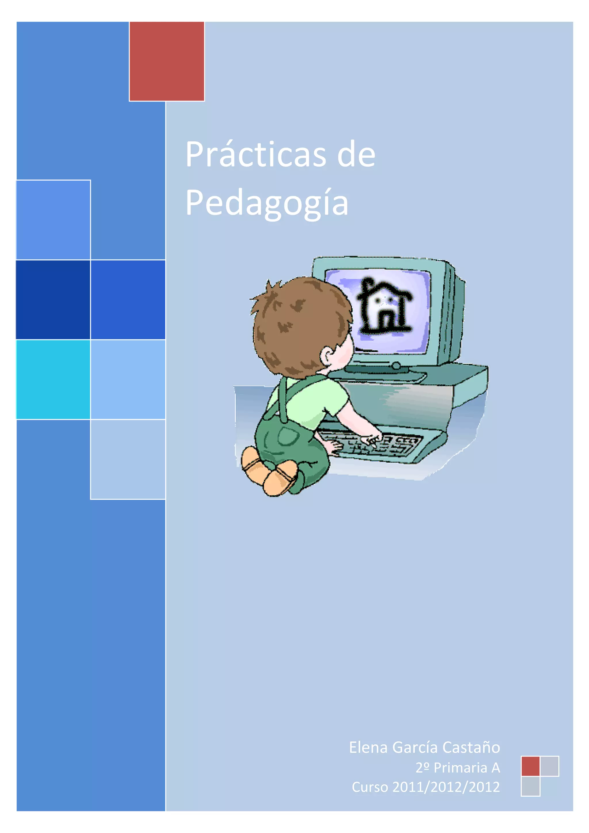Este documento presenta las prácticas de pedagogía de Elena García Castaño para su curso de 2o primaria A en el año académico 2011/2012. Incluye tres prácticas y una sección de bibliografía. El documento también incluye una reflexión individual sobre la asignatura "Educación y Sociedad" y preguntas sobre los apartados de competencias, contenidos, metodología, prácticas y evaluación.