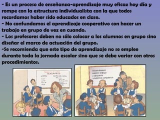 El documento describe tres prácticas educativas eficaces: 1) El aprendizaje cooperativo, donde los estudiantes trabajan en grupos para desarrollar habilidades de comunicación y apoyarse mutuamente. 2) Los deberes graduados según la dificultad de cada estudiante, para motivarlos y reforzar el aprendizaje. 3) El dominio del contenido a través de una organización coherente que se adapte al ritmo de cada estudiante.