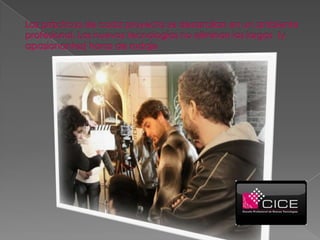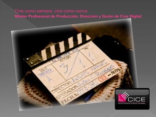 El documento presenta un máster profesional en producción, dirección y guión de cine digital, ofrecido por una escuela de nuevas tecnologías con más de 30 años de experiencia formando profesionales en el campo del cine. La escuela combina diferentes perfiles creativos para brindar una experiencia enriquecida que capacita a los estudiantes para convertirse en profesionales del cine digital.