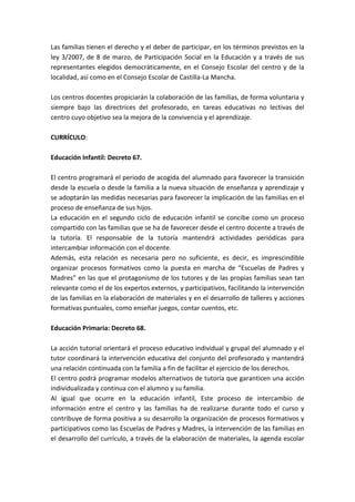 El documento describe las leyes y decretos españoles relacionados con la tutoría y la participación de los padres en la educación. Según la LOE y la ley de educación de Castilla-La Mancha, las escuelas deben fomentar la participación de las familias y mantener una comunicación efectiva con ellas. Los centros educativos deben establecer órganos como el Consejo Escolar para garantizar la participación de la comunidad educativa, incluyendo a las familias.