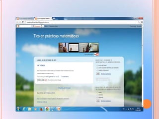Este documento describe el uso de prácticas TIC en una lección de matemáticas sobre números enteros. El profesor crea un blog con videos tutoriales de YouTube y encuestas sobre el tema. Los estudiantes ven los videos, completan las encuestas y resuelven problemas en el blog desde sus computadoras o teléfonos móviles. El profesor analiza los resultados de las encuestas para evaluar la comprensión de los estudiantes.