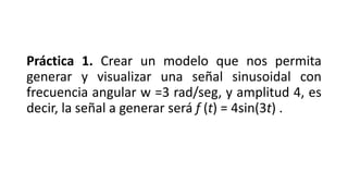 Este documento describe cómo crear un modelo en Simulink para generar y visualizar señales sinusoidales y cosenoidales. Explica los pasos para introducir bloques como "Sine Wave" y "Scope", configurar sus parámetros como amplitud y frecuencia, y conectarlos para simular una señal como 4sen(3t). Luego propone ejercicios para probar otros bloques de señal y visualizar múltiples señales en un solo o varios scopes.