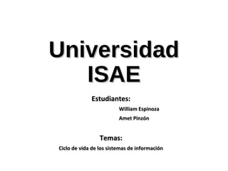 El documento describe los diferentes procesos del ciclo de vida de los sistemas de información, incluyendo la investigación preliminar, determinación de requisitos, diseño, desarrollo, prueba, implementación y evaluación. También discute los tipos de sistemas de información y los métodos del ciclo de vida, así como los actores clave en un proyecto de sistemas, como el gerente general, el grupo multidisciplinario, los analistas de sistemas y los usuarios.