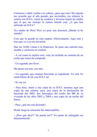 Un hombre recibió un contrato de compra de un coche que nunca compró. Al investigar, descubrió que su DNI había sido robado el año pasado y usado para abrir cuentas bancarias y comprar varios coches a su nombre. Ha tenido que presentar varias denuncias a la policía y bancos, y ha sido contactado por otras dos compañías de autos sobre coches adicionales comprados fraudulentamente a su nombre. Advierte a otros sobre los peligros de no denunciar el robo de un DNI.