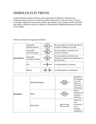 Este documento presenta una serie de símbolos eléctricos utilizados para representar elementos como generadores, receptores, elementos de maniobra y protección en planos eléctricos. Explica que estos símbolos permiten dibujar planos de manera más rápida y evitan malinterpretaciones, en lugar de usar dibujos realistas. A continuación, describe cada símbolo y proporciona ejemplos de circuitos reales y sus representaciones simbólicas.
