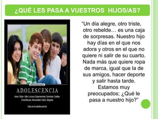 Los adolescentes experimentan cambios físicos, emocionales y sociales que los hacen sentir inseguros sobre su identidad. Los padres deben apoyarlos y establecer normas claras mientras les dan espacio para desarrollarse, pero también comunicarse y enseñarles valores. Un estilo democrático de crianza ayuda a los hijos a formar una identidad propia y autoestima sana durante esta etapa de transición.